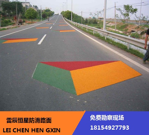 防滑涂層由黏合劑及防滑骨料組成,涂層表面可撒布玻璃微珠。成型后涂層的顏色主要為紅、綠、黃、藍。目前按施工方法來分,有熱熔型和冷涂型。